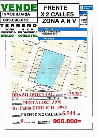ZONA A N V BRAZO ORIENTAL: PADRON ÙNICO Nº 135.387 PESTALOZZI 3970 Y ERLICH 3979 (FRENTE X 2 CALLES) ESPECTACULAR TERRENO de 5.544 m2 con ESTRUCTURA. ZONA A N V para VIVIENDA PROMOVIDA *VENDE INMOBILIARIA Àlvaro EIRALE OCAMPO 099.698.012 y 094.698.012 (2026.TODOS los TERRENOS) Servicios Inmobiliarios en Uruguay desde 1986.alvaroeirale@gmail.com HTTPS://alvaroeirale.com.uy COMISION 3 % + IVA RUT217892740016
